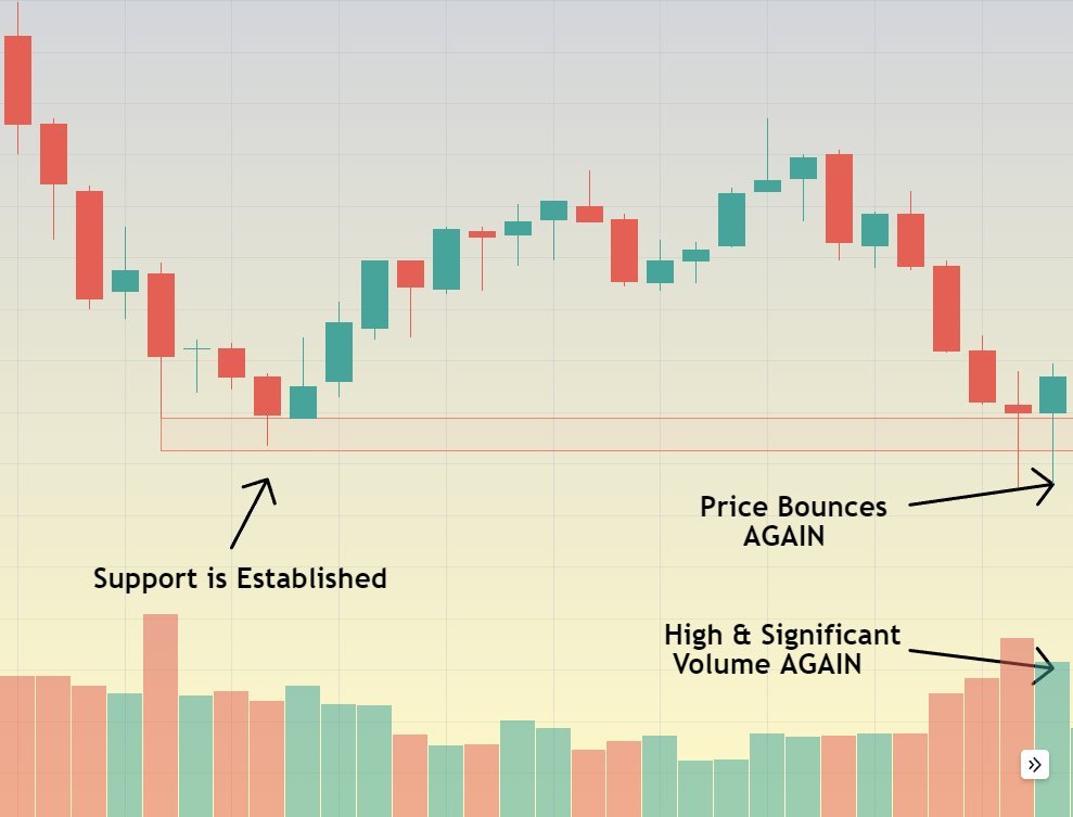 Once the price action reaches our support level, it bounces immediately WITH high volume