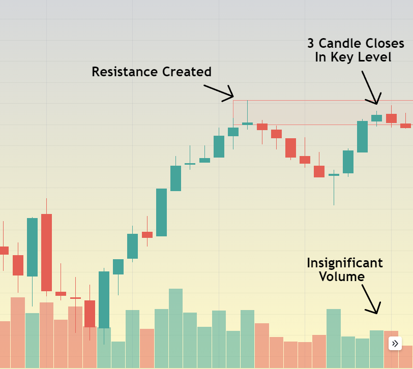 1) The reaction was not fast. Sellers are not defending this level with urgency 2) The volume is low. Sellers are not defending this level with strength 3) 3 candles closed within our level. Buyers are chipping away at this resistance