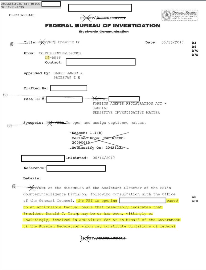 The wording in this FBI Counterintelligence (D5-REIT) “Opening EC” is carefully crafted legalese. It had to justify opening a sensitive counterintelligence case (targeting the sitting U.S. President) while avoiding any direct allegation that Donald Trump was “a Russian agent.”