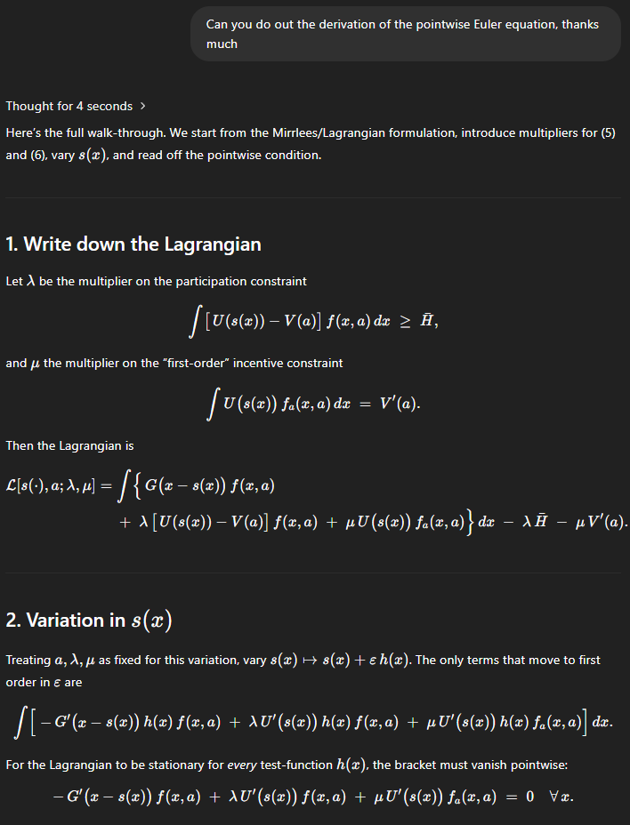I'm reading Holmstrom 1979, and I'm a lazy student who doesn't want to actually do the work, so I'm making ChatGPT do it for me. It is very simple, I just give o4-mini screenshots of parts and ask, wtf is going on. It tells me exactly what Holmstrom is saying, much more clearly