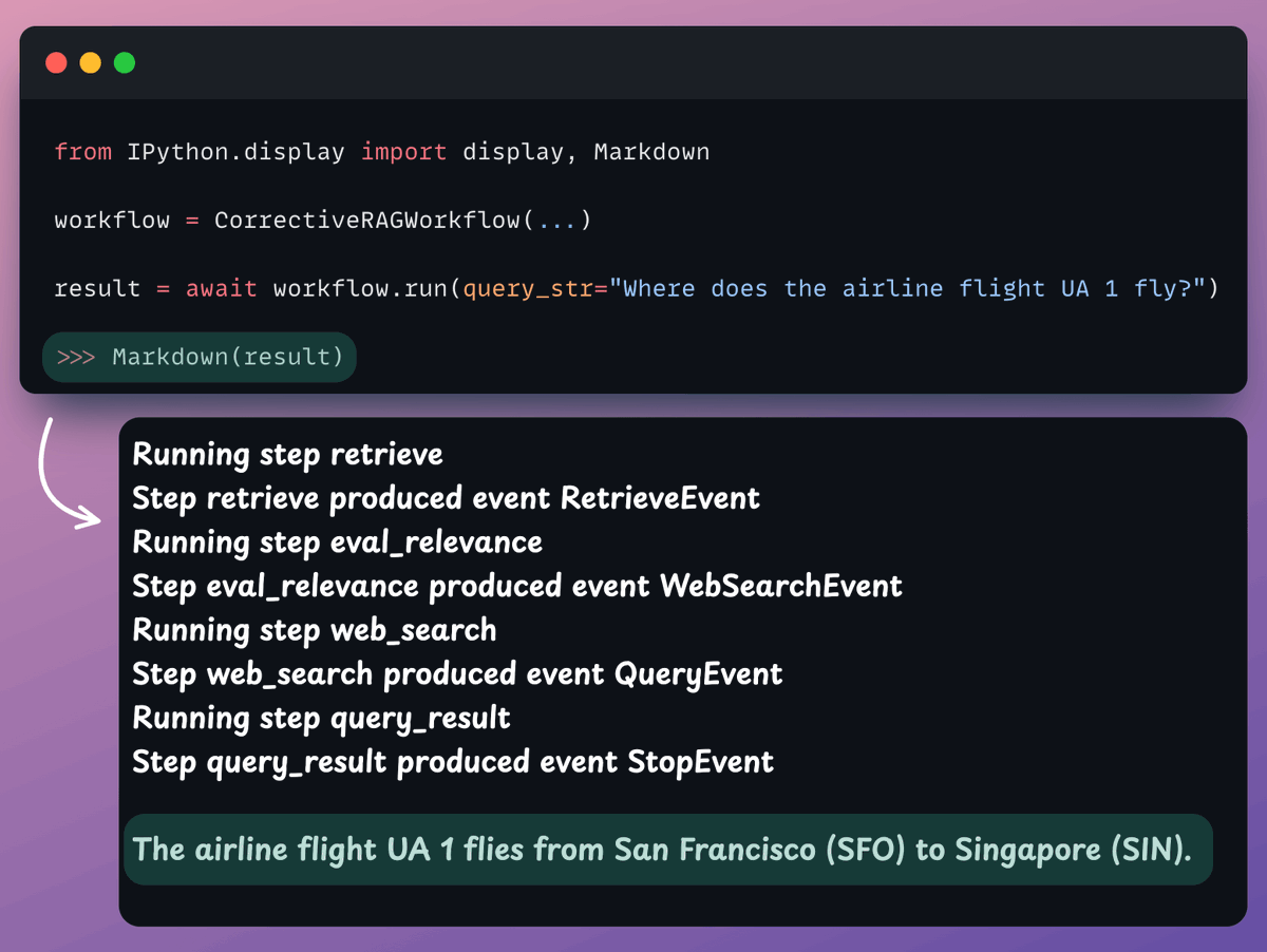 We pass in the LLM, vector index, and web search tool to initialize the workflow.