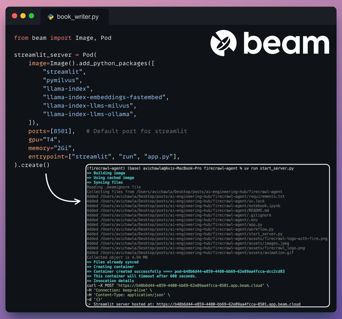 Beam launches the container and deploys our streamlit app as an HTTPS server that can be accessed from a web browser.