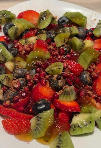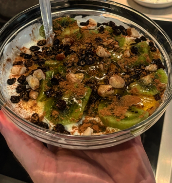 -Raw goat's kefir with some raisins, one Brazil nut, raw honey (this one has some propolis), kiwis, Ceylon cinnamon, glycine (3 grams), vanilla extract, taurine (1 gram), colostrum, bee pollen, berries and a bit of pomegranate.