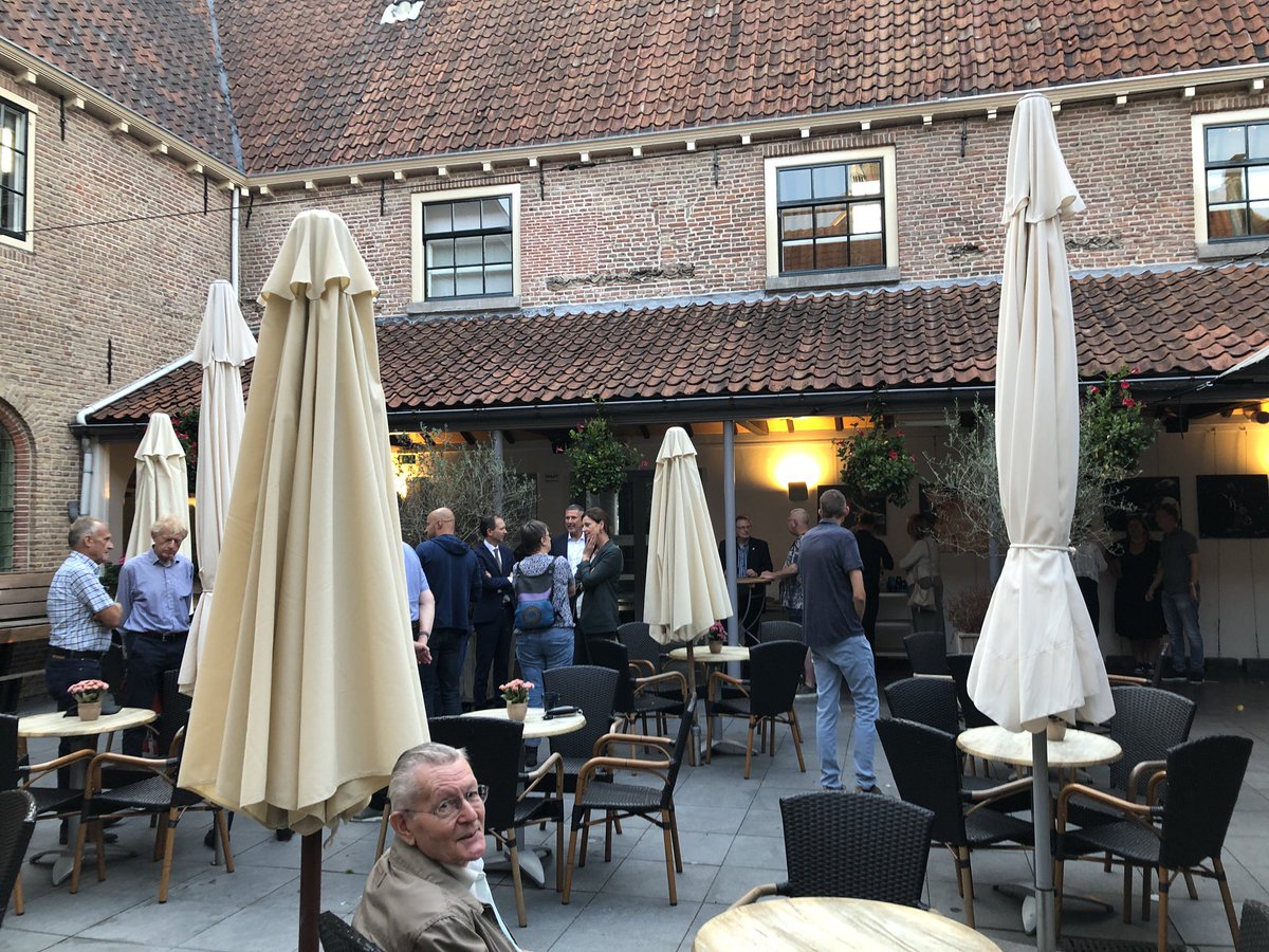We zijn in de Observant. Leuk binnenpleintje. Ik zie nu al acht mensen. Tjebbe van Oostenbruggen - staatssecretaris- is er ook. Ik schudt hem en Van Hijum de hand.