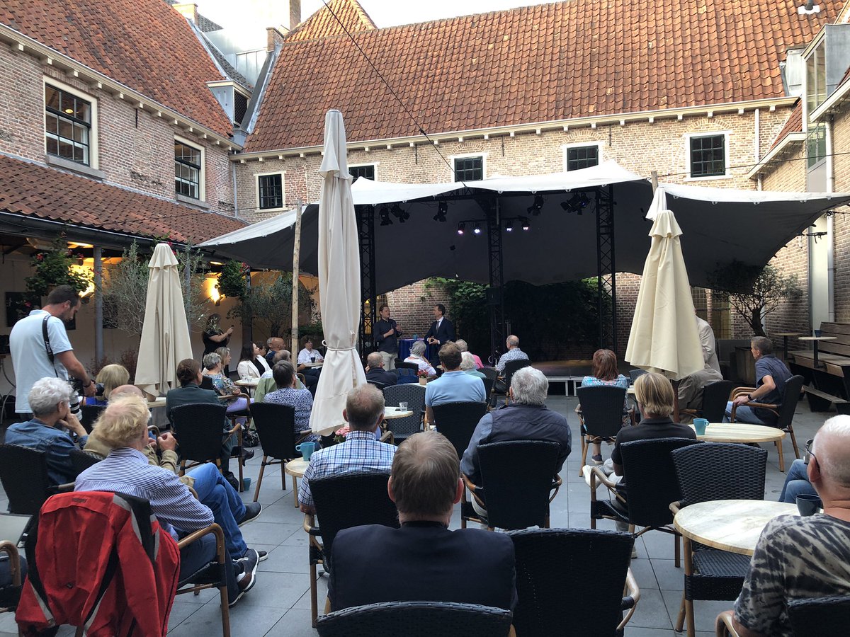 De zaal is te klein dus we gaan naar de binnenplaats. Tweede argument: het is daar frisser. Er is ook een ANP-fotograaf dus deze bijeenkomst wordt echt vastgelegd.