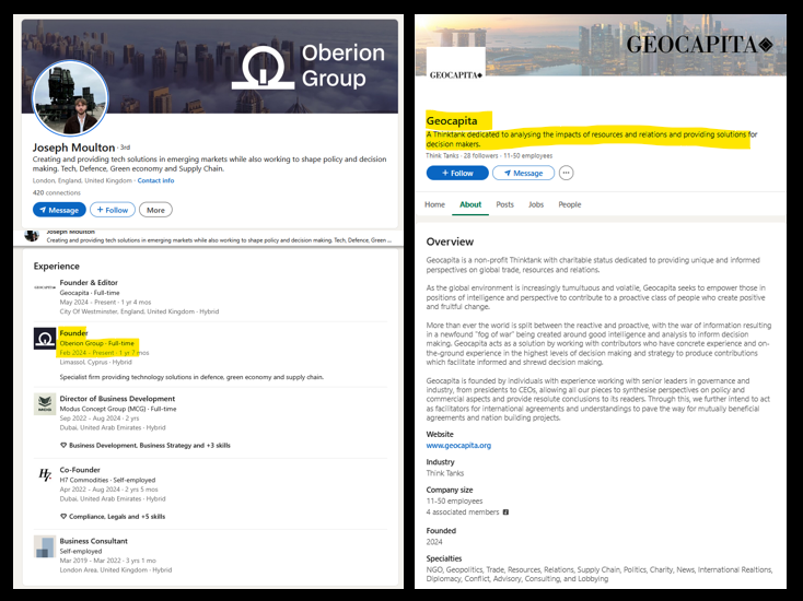 Oddly, despite claiming Oberion is based in Dubai, Moulton's LinkidIn profile suggests he and it have since Febraury 2024 have been based in Limassol, Cyprus, yet his previous ventures suggest he's been in Dubai since April 2022.
