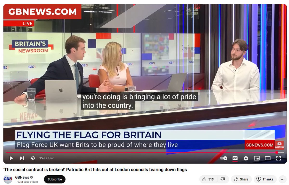 Flag Force UK’s founder, Joseph Moulton, recently had a very softball interview on GB "News" to promote the group’s flag campaign as a way of 'rekindling community spirit'.