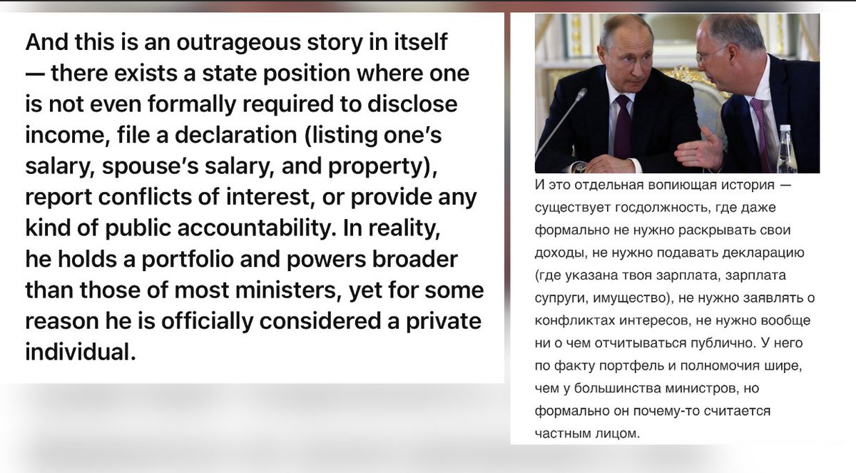 Formally, Dmitriev holds a position that does not require disclosure of assets or conflicts of interest, even though he manages large amounts of state budget funds and, in practice, has more authority than many ministers.