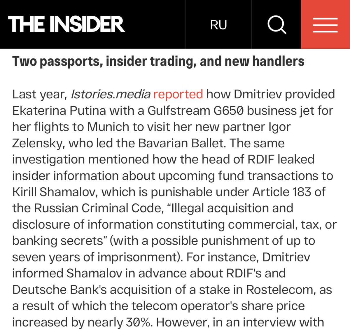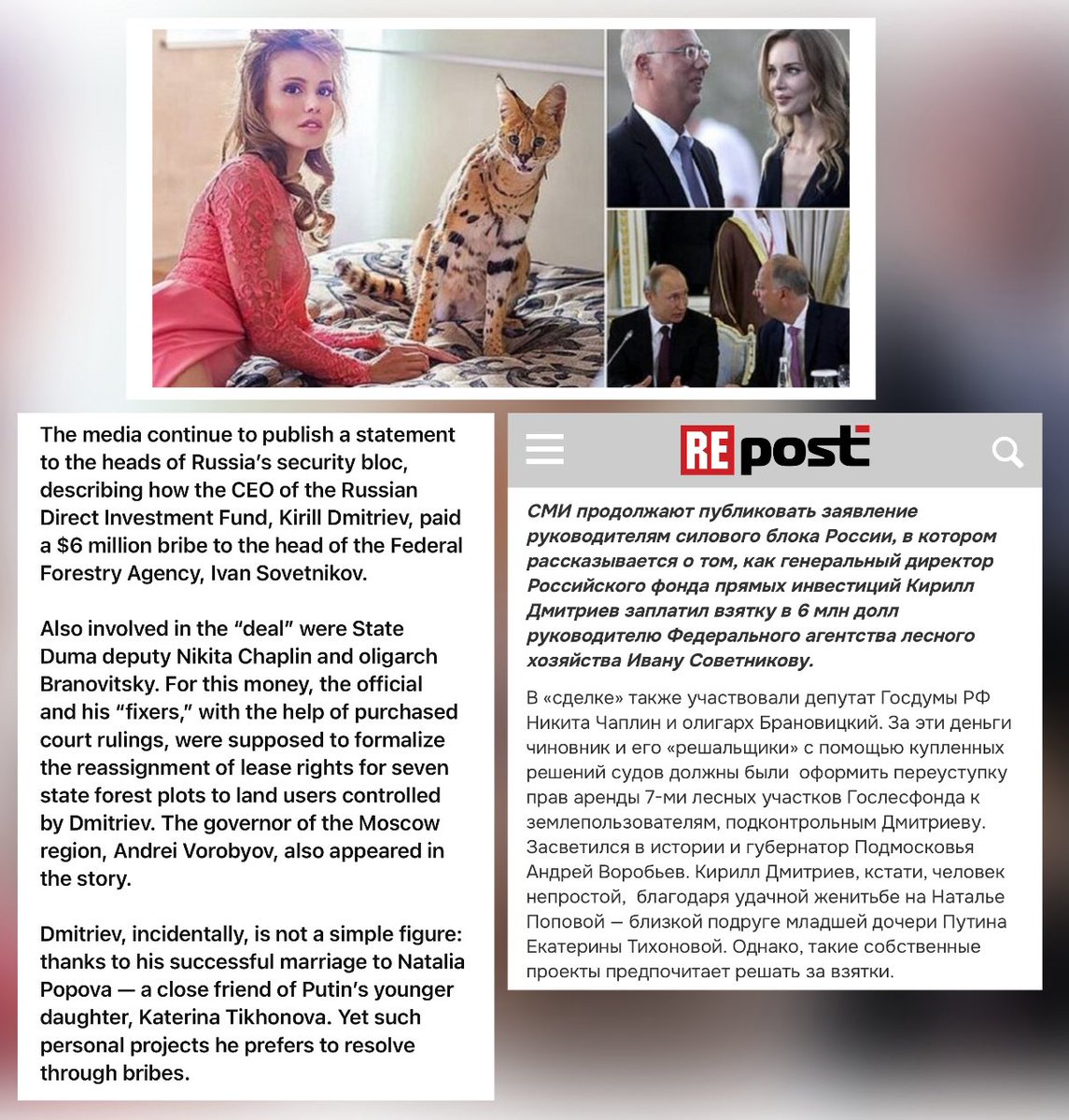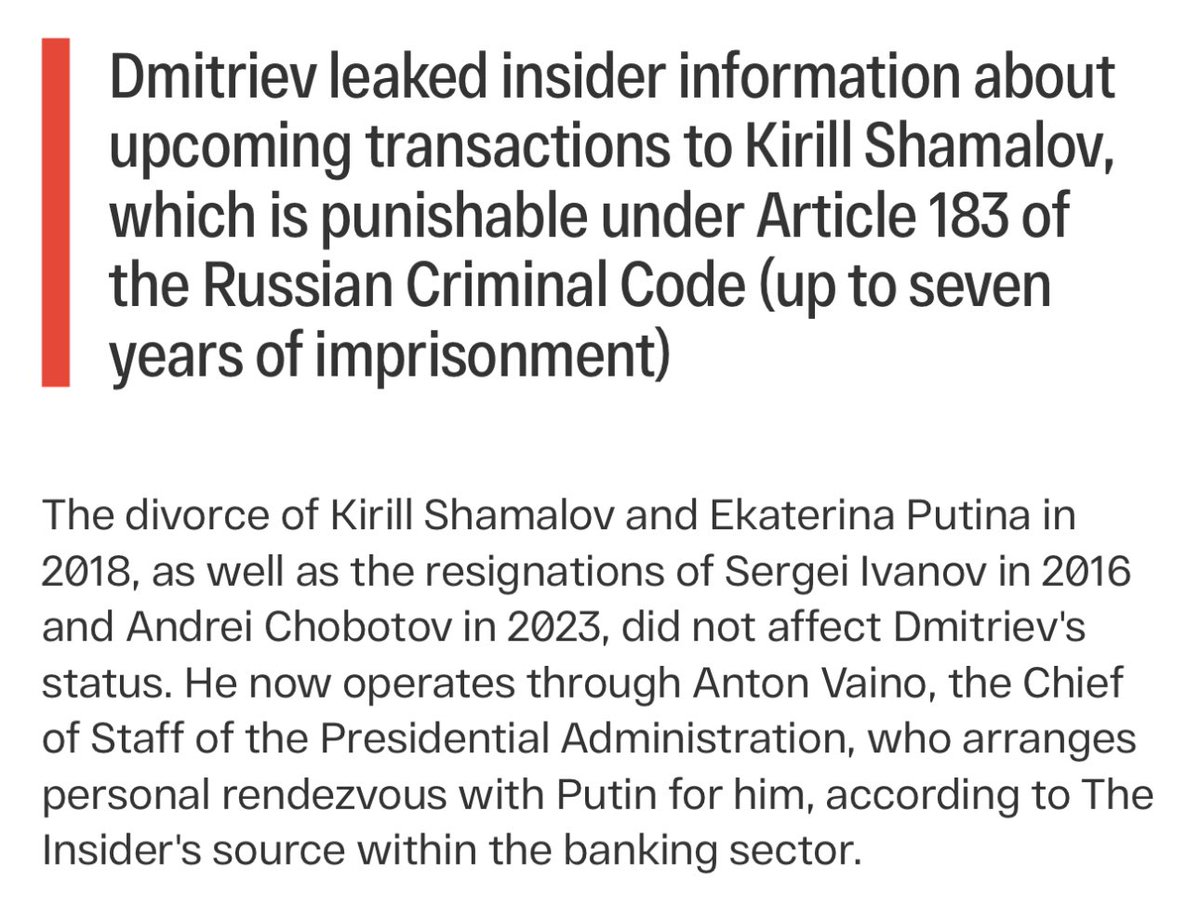 Kirill Dmitriev leaked insider info on RDIF & Deutsche Bank’s Rostelecom deal — shares jumped 30%. The beneficiary? Kirill Shamalov, ex-husband of Putin’s daughter Katerina Tikhonova. Corruption at the heart of the Kremlin’s family business.