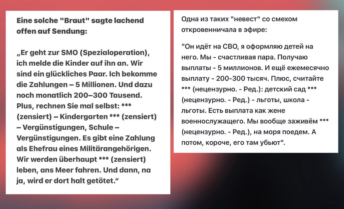 "Schwarze Witwen" erläutern ihre Strategien, die sich in ganz Russland verbreitet haben: „Wir heiraten, kriegen 5 Millionen Rubel, monatliche Zahlungen, dann geht er aufs Schlachtfeld.“ Was wie Zynismus klingt, ist für viele Realität und ein Geschäftsmodell, das funktioniert.