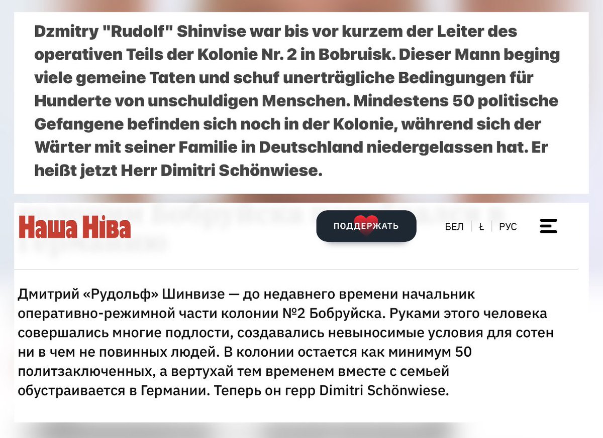 Am 13. August 2025 berichtete die belarussische Ausgabe von "Nasha Niva", dass der Leiter des operativen Teils der Strafkolonie Nr. 2, Dzmitry Shinvise, der der brutaler Misshandlung von Gefangenen beschuldigt wird, nach Deutschland ausgewandert ist.
