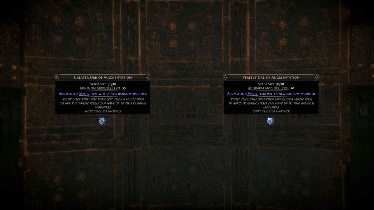 There are now higher tier versions of all basic crafting currency. Greater and Perfect currency items add mods with a guaranteed minimum level, ensuring better results for your crafts.
