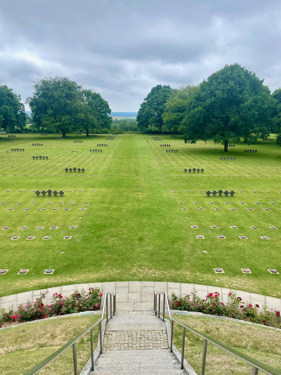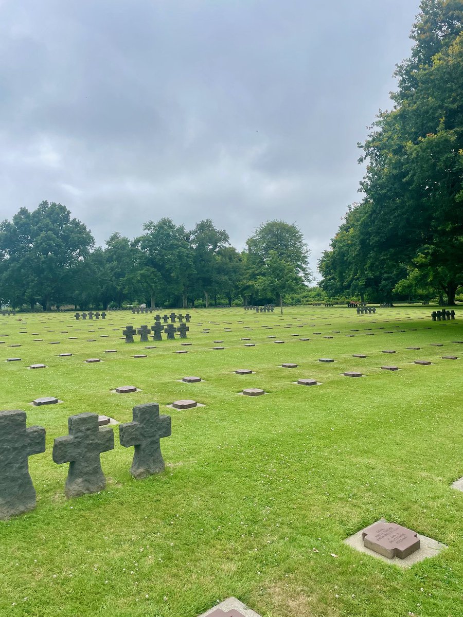 After we visit the American Cemetery, we offer to take our guests to the nearby German Military Cemetery. It's also a sacred place, but feels different than the US Cemetery. The design is simpler, with soldiers buried two to a grave, and small ground-level markers. 6/x