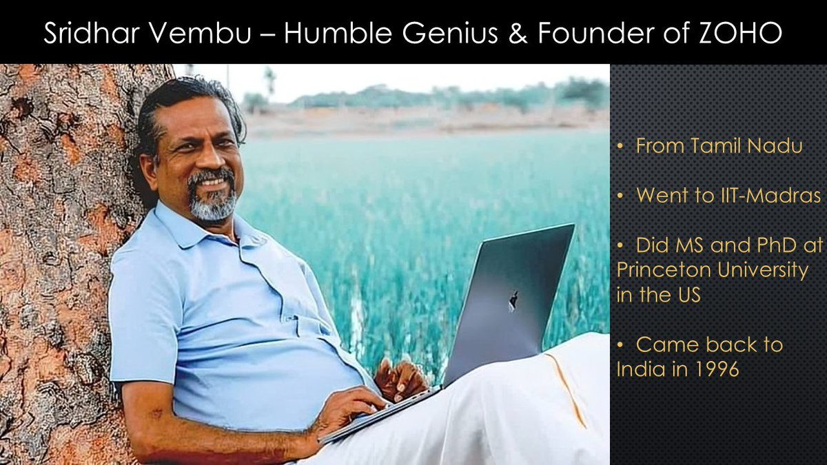 Sridhar Vembu comes from a small town in the state of Tamil Nadu. He went to IIT, the top tech university in India, and then did his PhD at Princeton University.