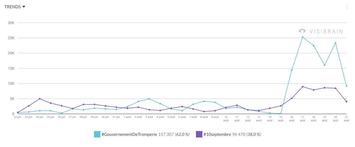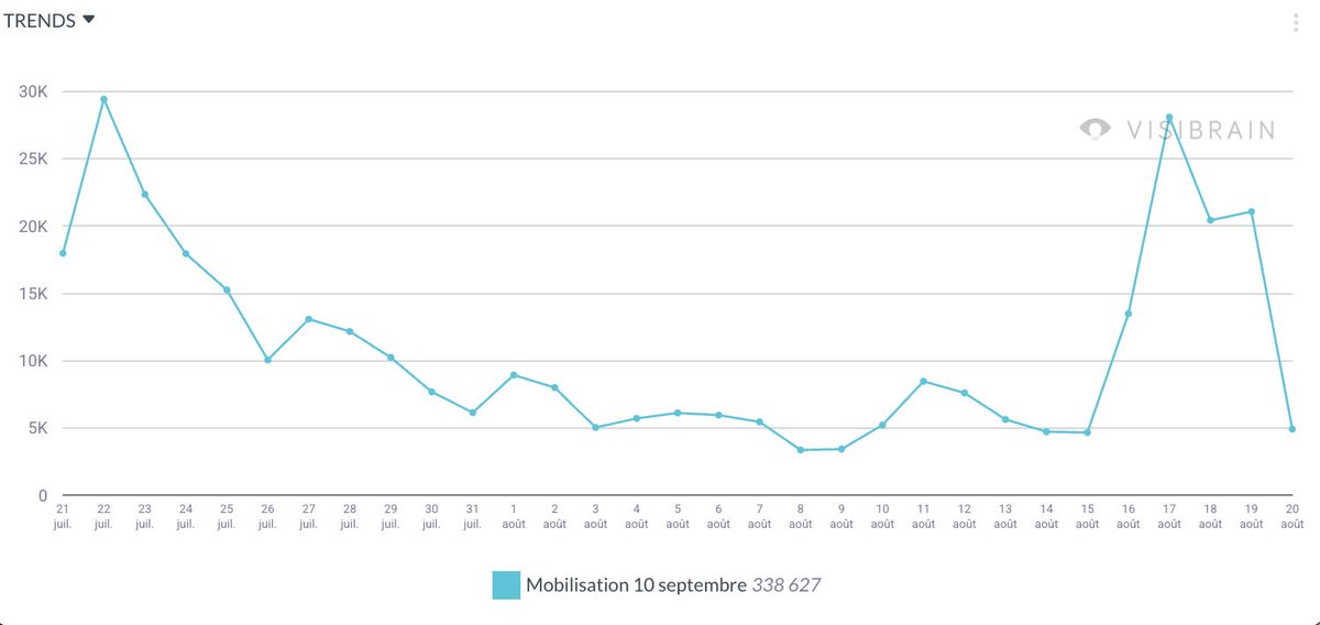 Si on regarde l'analyse de la popularité de ces mots-clés, on remarque un vrai rebond les 16, 17 et 18 août, au moment du soutien de Jean-Luc Mélenchon et de LFI à ce mouvement.