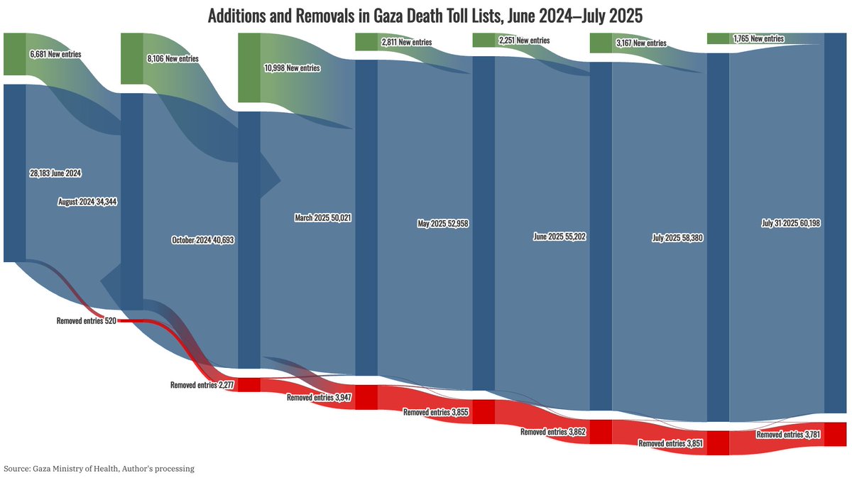 Yesterday (8/4), the Hamas-run Gaza Health Ministry (MOH) released its 12th list of the dead (via Telegram and WhatsApp) since the Israel-Hamas war began, containing 60,198 entries and covering up to July 31. Longer analysis of data quality and demographics 🧵: