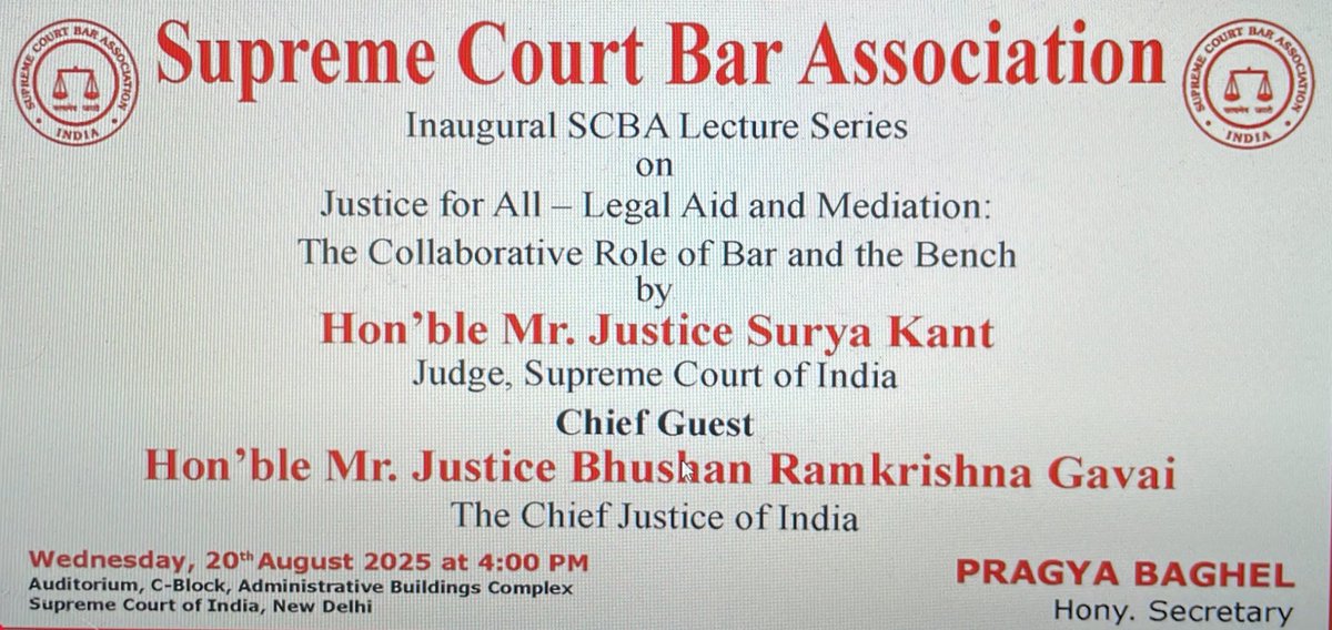 The lecture is titled “Justice for all- Legal Aid and Mediation: The collaborative role of Bar and the Bench”