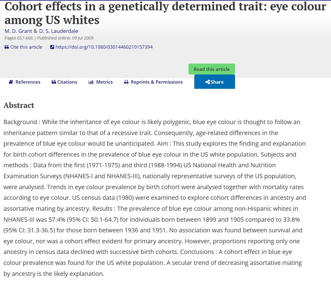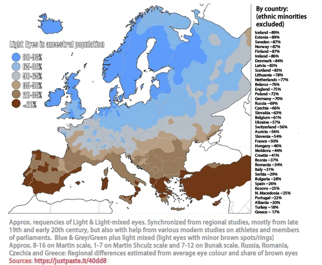 One of the effects of Ellis Island immigration to America: of white Americans born between 1899 and 1905, 57.4% had blue eyes (roughly on par with Belgians). Of those born between 1936 and 1951, only 33.8% (roughly on par with Italians) did.