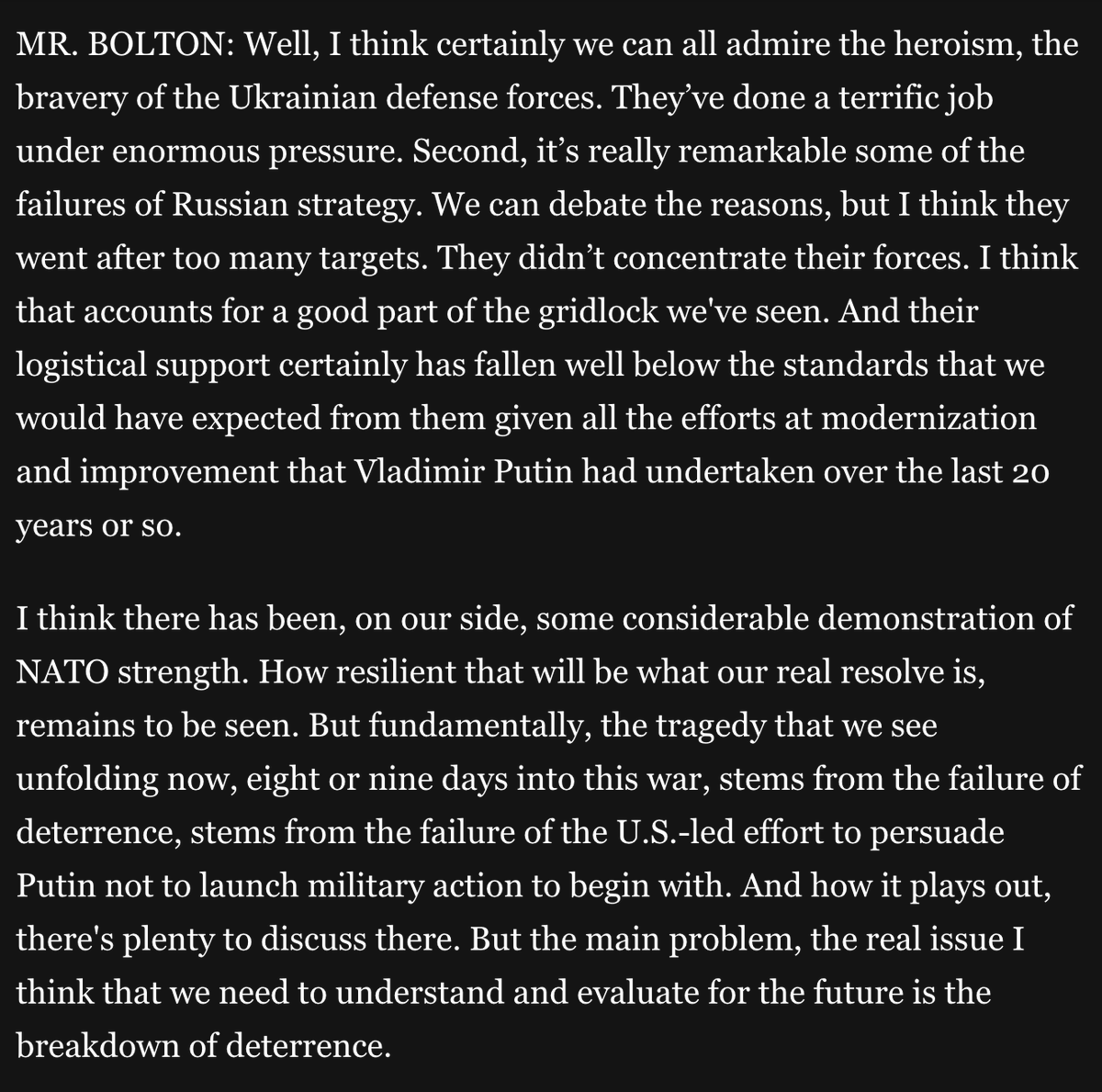 The best I can tell is from this excerpt where he blamed Putin's invasion of Ukraine on America's failure to project a credible military threat.