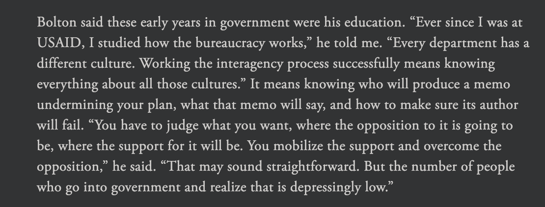 Bolton didn't talk about USAID in terms of delivering aid or fostering development. He talks about it as a training ground for bureaucratic warfare: "You have to judge what you want, where the opposition to it is going to be, where the support for it will be. You mobilize the support and overcome the opposition."