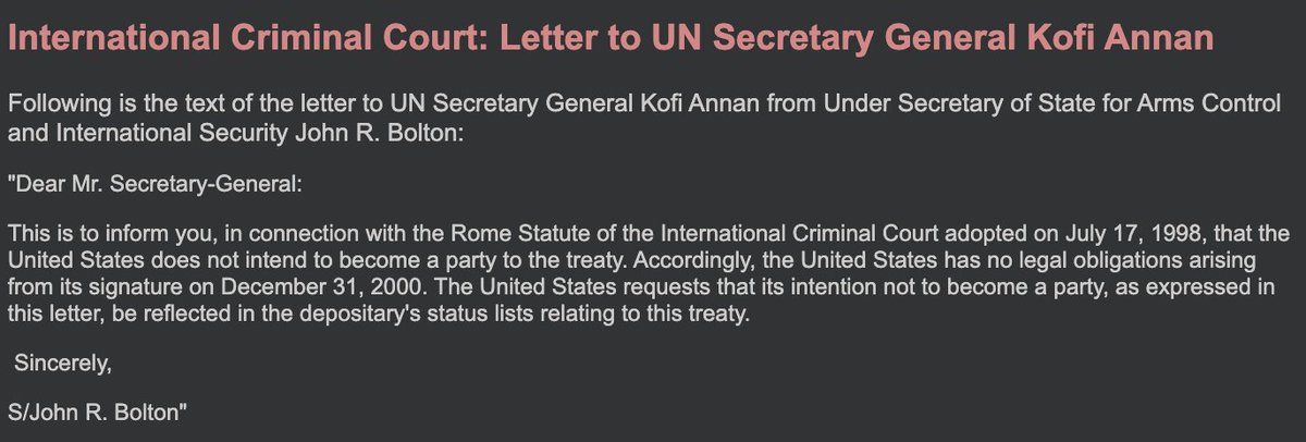 He rejected US joining in the ICC -- he was distrustful of supranational institutions.
