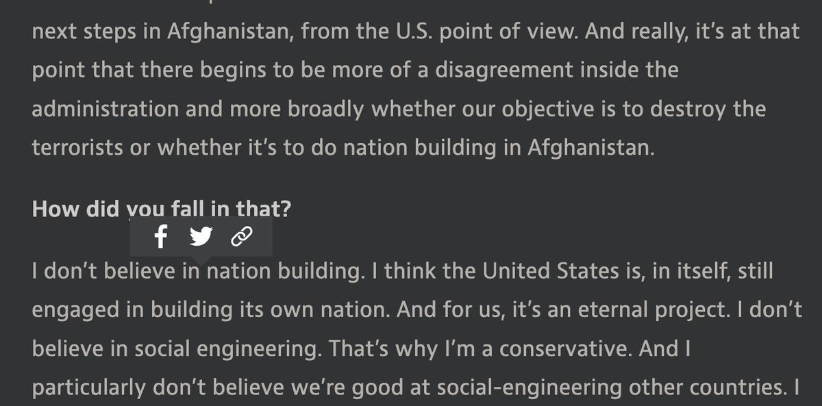 In fact, he said "I don’t believe in nation building. I think the United States is, in itself, still engaged in building its own nation. And for us, it’s an eternal project. I don’t believe in social engineering."