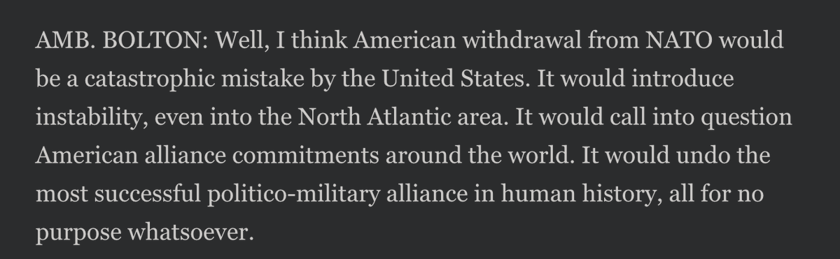 @GatestoneInst My guess is that the Trump administration initially loved him for his hardline U.S. sovereignty stance -- on paper. But fired him when they found out that in practice, it meant waging war everywhere.