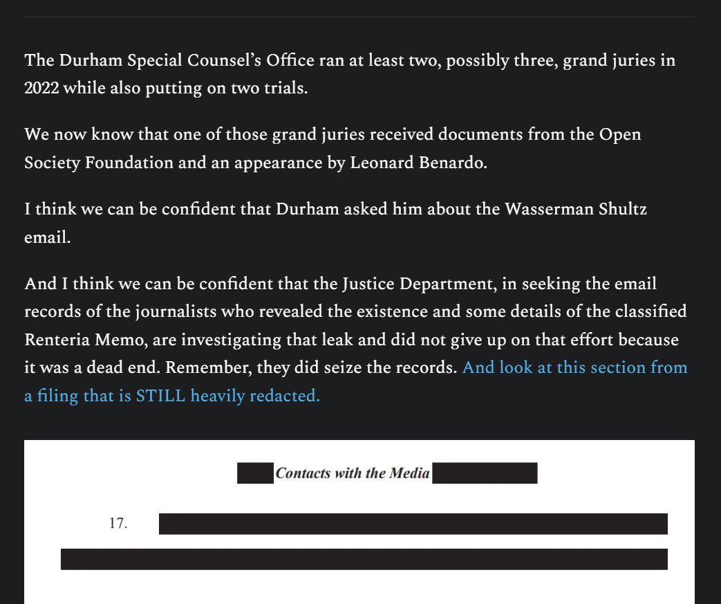 My article traced several subjects: the leaks investigations, the NYT engaging in a court battle against DOJ, Renteria memo, and Special Counsel Durham's efforts to investigate the Russian memoranda.