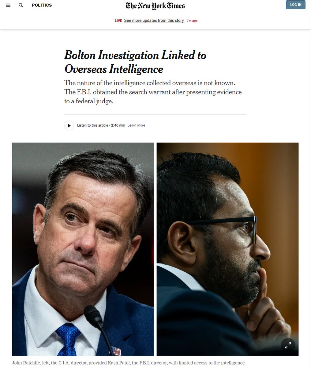 "The information that provided the basis for the warrant to search John Bolton’s home on Friday was based on intelligence collected overseas by the C.I.A..."