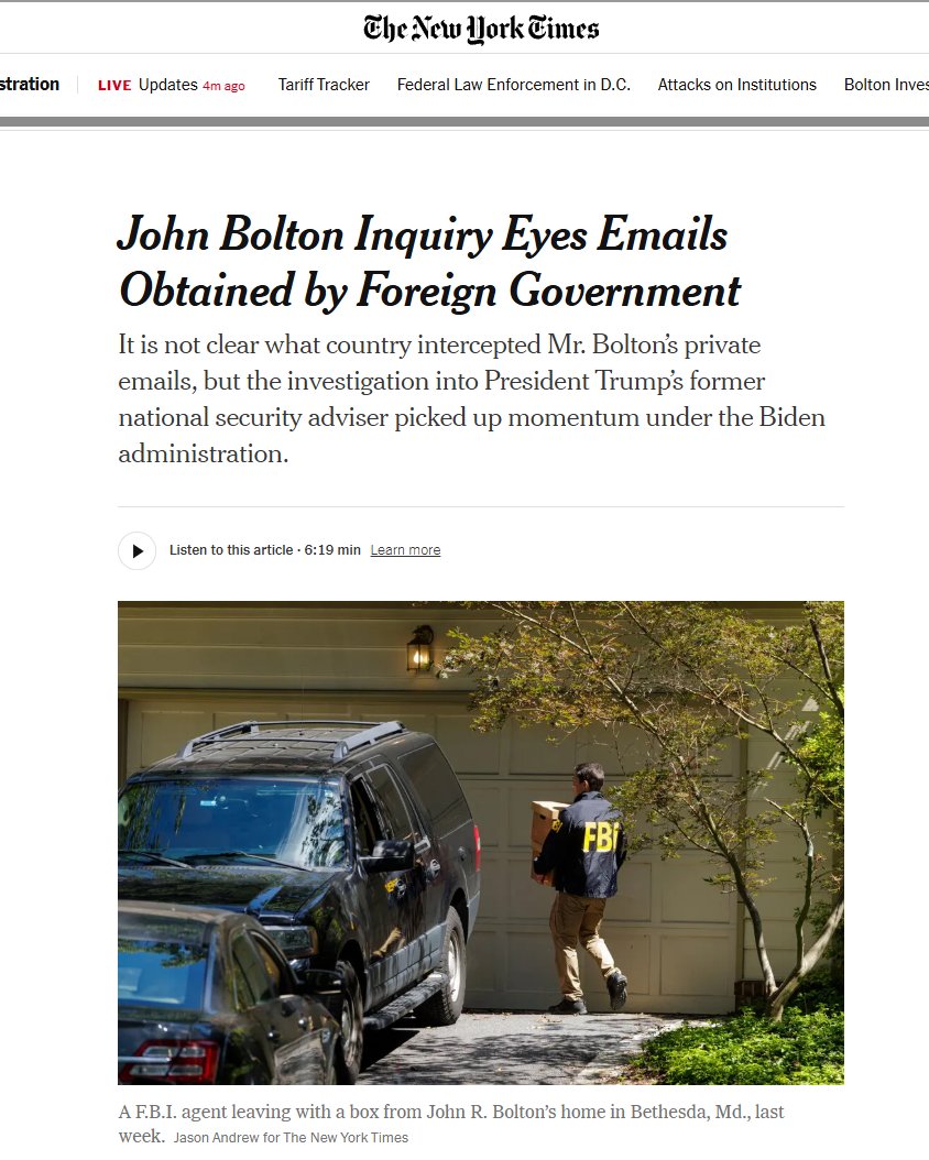 "The search of the home and office of Mr. Bolton [is] a major escalation of a long-running inquiry into whether he collected or leaked sensitive national security information..."
