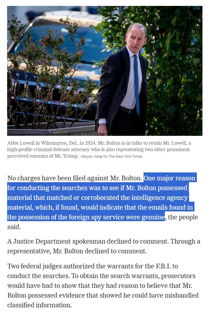 "One major reason for conducting the searches was to see if Mr. Bolton possessed material that matched or corroborated the intelligence agency material, which, if found, would indicate that the emails found in the possession of the foreign spy service were genuine"