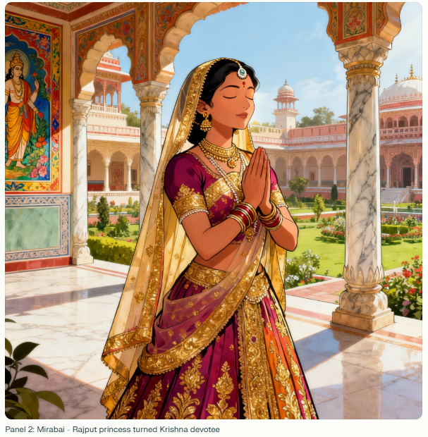 Mirabai (1498-1546) was born into Rajput royalty as the daughter of Ratan Singh, brother of Merta's ruler. Her marriage to Prince Bhoj Raj of Chittor solidified her position within medieval India's highest nobility. Her Krishna devotion was a conscious spiritual choice, not social marginalization.