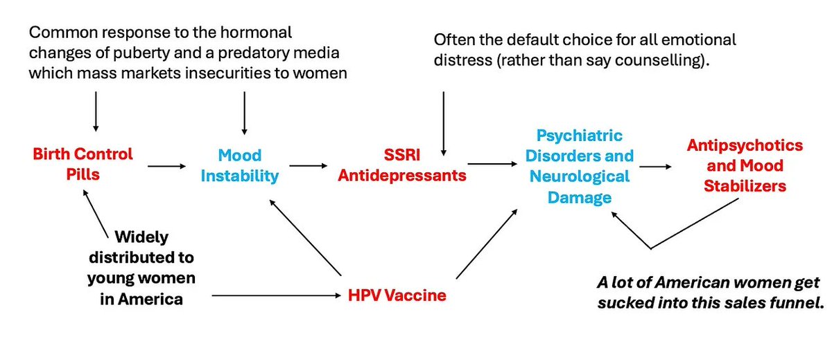 It starts with putting teens on birth control to fight acne → then it triggers depression → and that leads to SSRIs → which can cause mania → ending in antipsychotics.