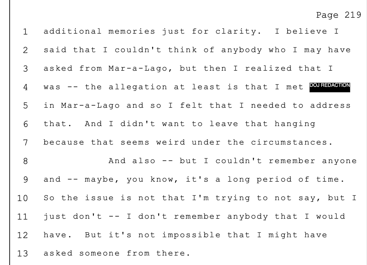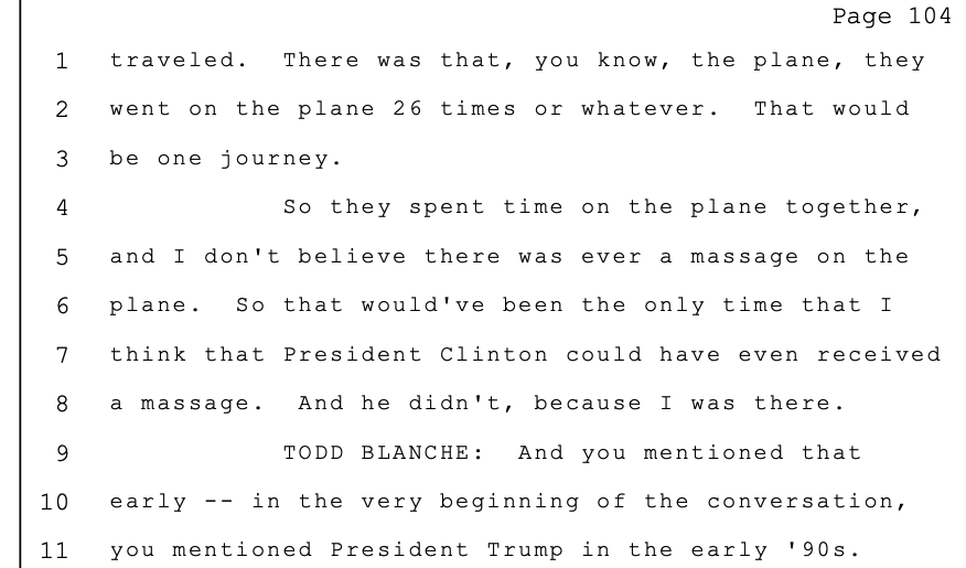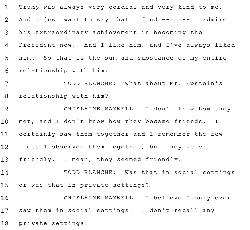 Maxwell on Epstein's relationship with Trump: "I don't know how they met, and I don't know how they became friends. I certainly saw them together and I remember the few times I observed them together, but they were friendly. I mean, they seemed friendly."