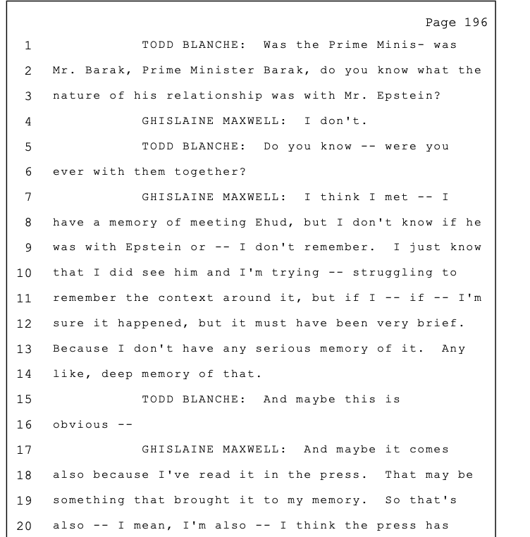 She doesn't know anything about Epstein's relationship with Ehud Barak.