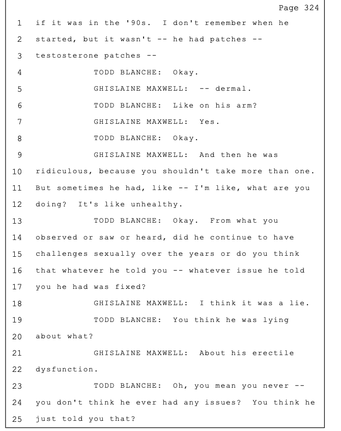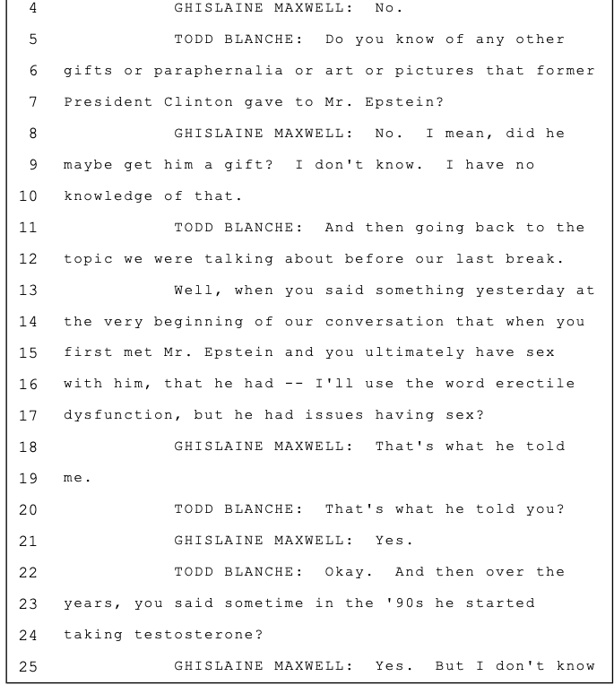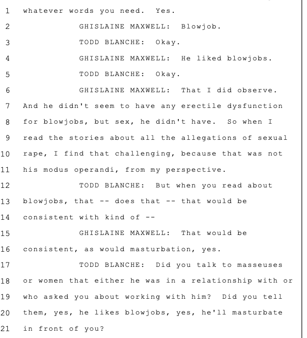 Ghislaine says that Epstein told her he had issues having sex. But she thinks he was lying, because he masturbated and liked to get blowjobs.