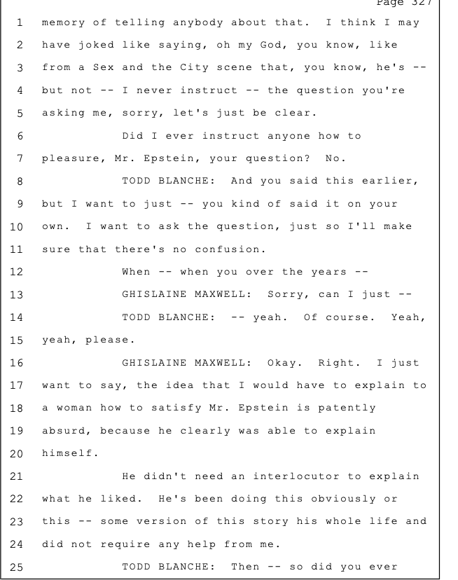 Ghislaine said that she never told any woman how to pleasure Epstein. If he needed someone to know, "he clearly was able to explain himself."