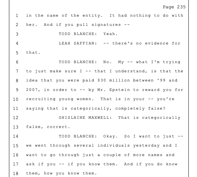 Ghislaine denies she was paid $30 million to recruit girls for Epstein.