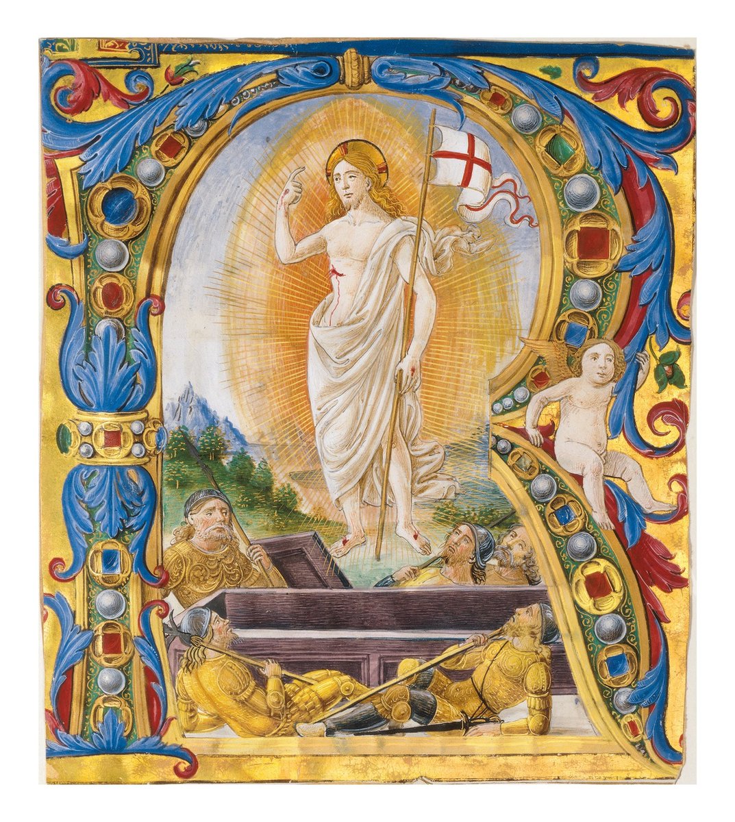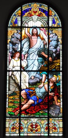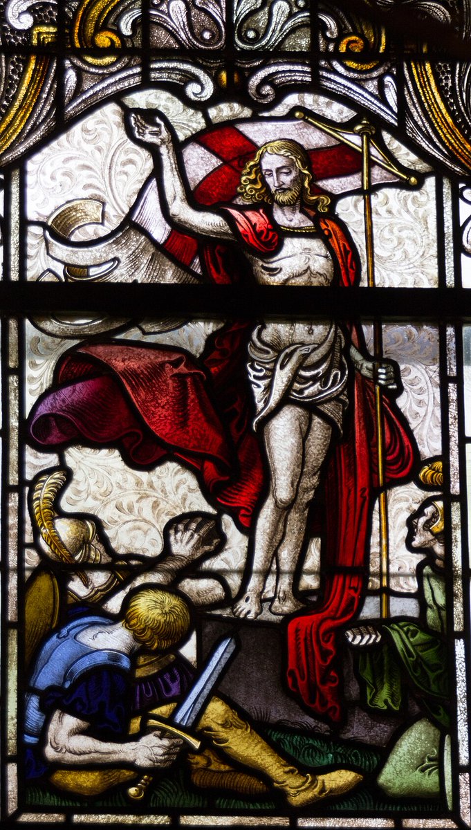 Art: Stained glass, Dorfkirche Hohen Neuendorf Fensterbild Auferstehung, Wikimedia Commons.