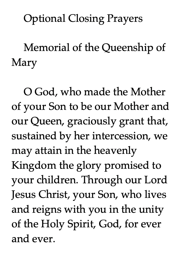 O God, who made the Mother of your Son to be our Mother and our Queen, graciously grant that, sustained by her intercession, we may attain in the heavenly Kingdom the glory promised to your children...