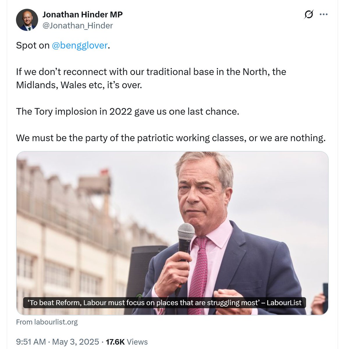 Blue Labour are charlatans just as much as Reform. It could talk about (green, clean) industrial strategy to rebuild a productive base for regional development. It doesn't. It dangles the same promise to bring back an imagined mid 20th Century though "patriotism" and "tradition"