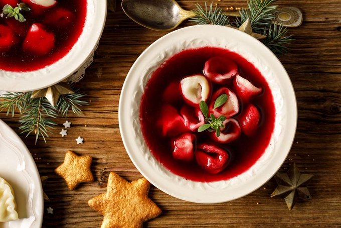Clear beetroot soup, served with dumplings (uszka). A Christmas Eve must. Beets were cultivated in Poland since the Middle Ages, and barszcz in its modern form became a noble specialty by the 16th century.