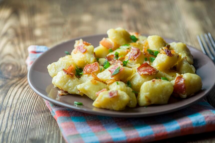 Potato dumplings shaped like hooves, eaten with gravy or butter. A thrifty way to use leftover potatoes, common since the 18th century.