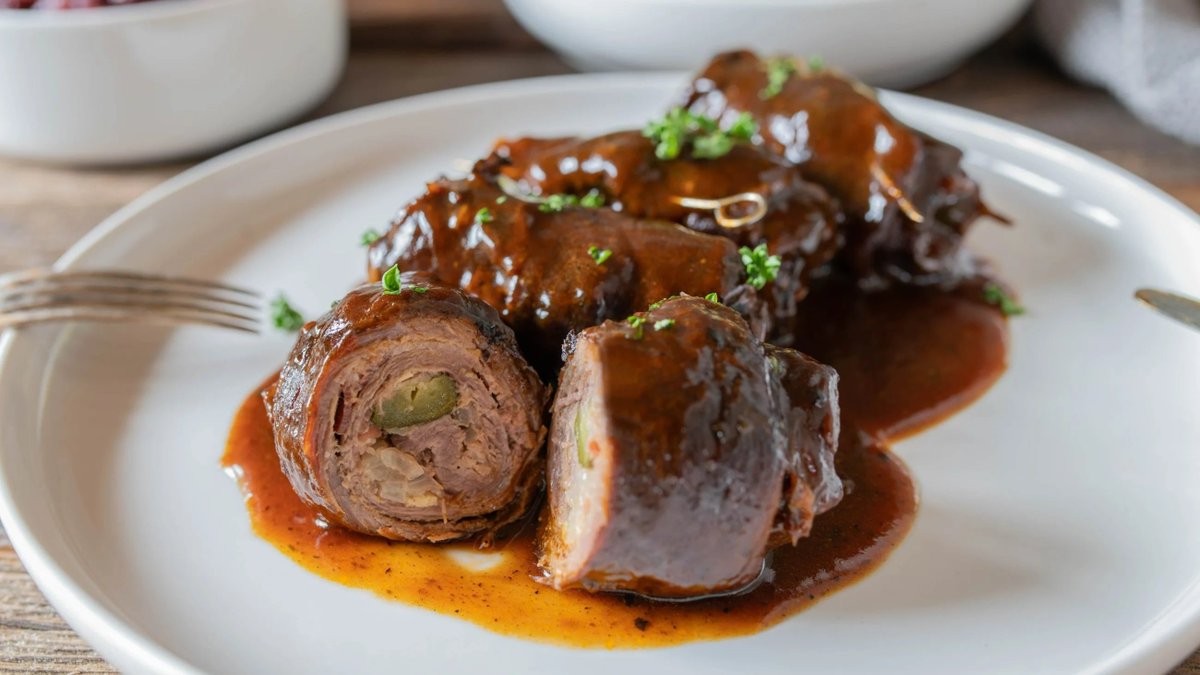 Thin slices of beef rolled around cucumber, bacon, and onion, simmered until tender. A dish of the Polish-Lithuanian nobility, mentioned in 17th-century cookbooks.
