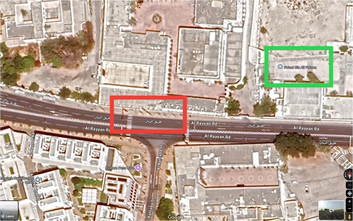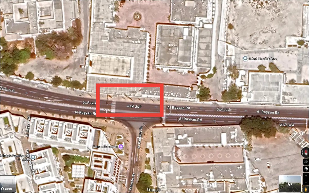 The red box marks the stretch of Al Rayyan Rd where Bolton was filmed.