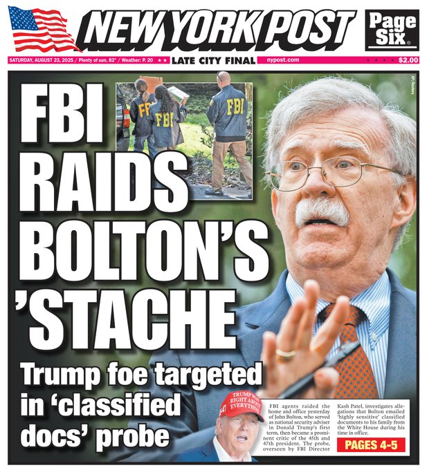 “FBI RAIDS BOLTON’S ’STACHE” — Trump’s fiercest foe now caught in a classified docs probe.
