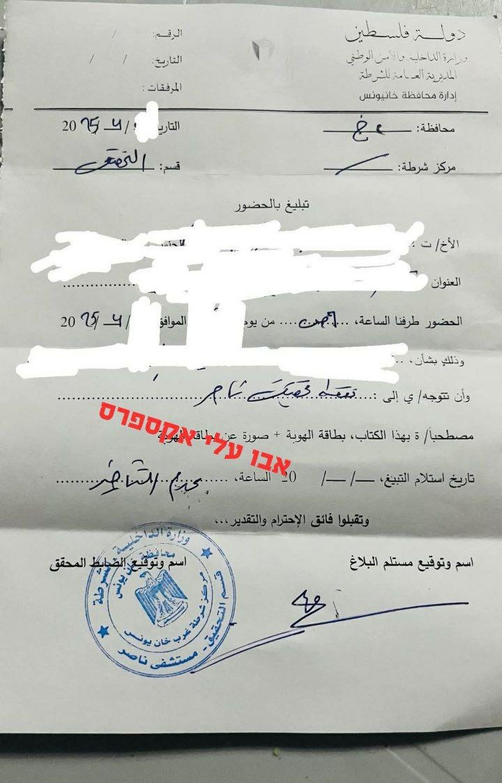 One month prior, @AbuAliEnglishB1 reported that Hamas’ Interior Ministry ordered a Gaza resident to appear for interrogation inside Nasser Hospital. The document was signed: