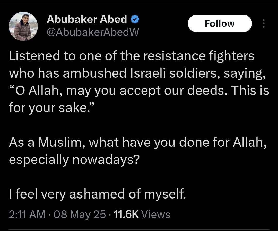 Abubaker, a "journalist" working for Drop Site News and the Iranian state-run PressTV, expresses remorse that he hasn't engaged in acts of terrorism like his colleagues in Gaza.