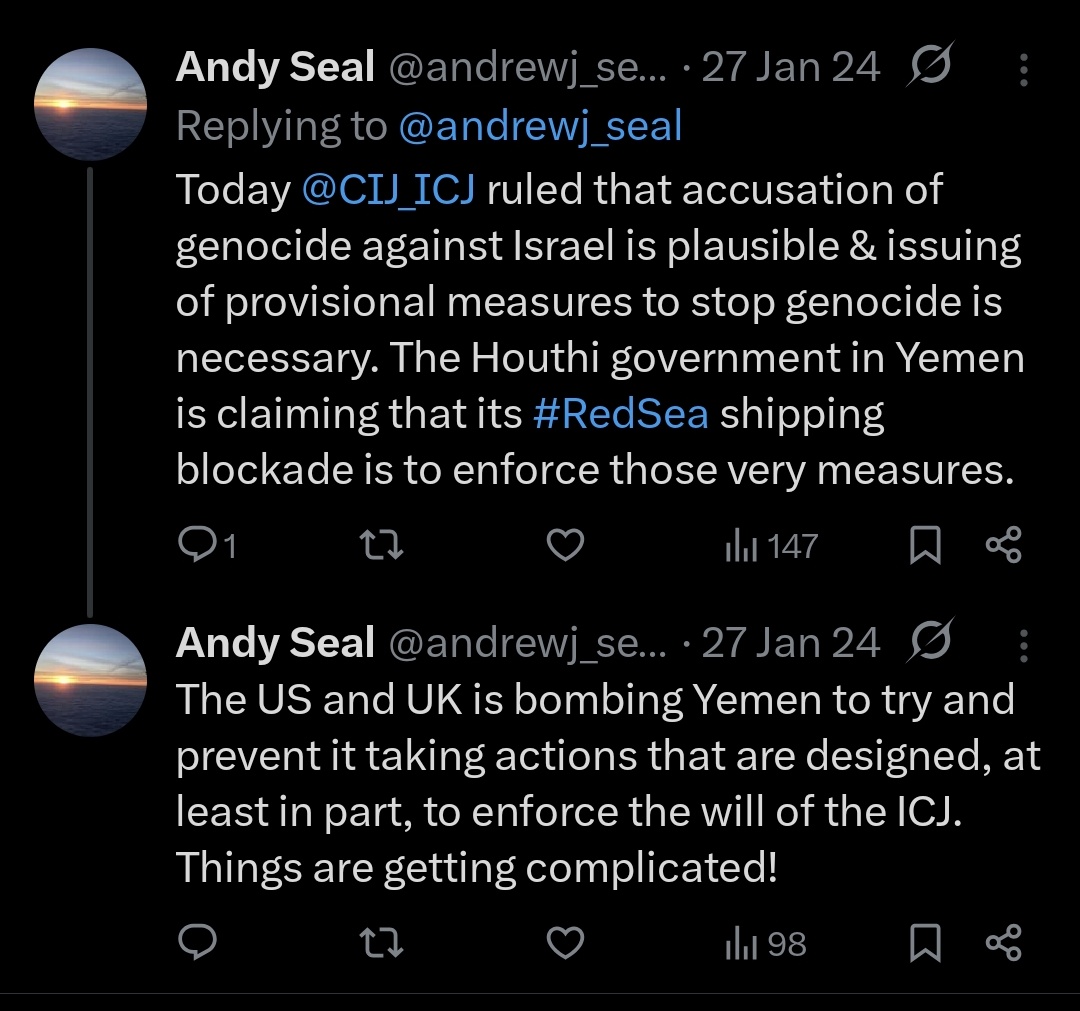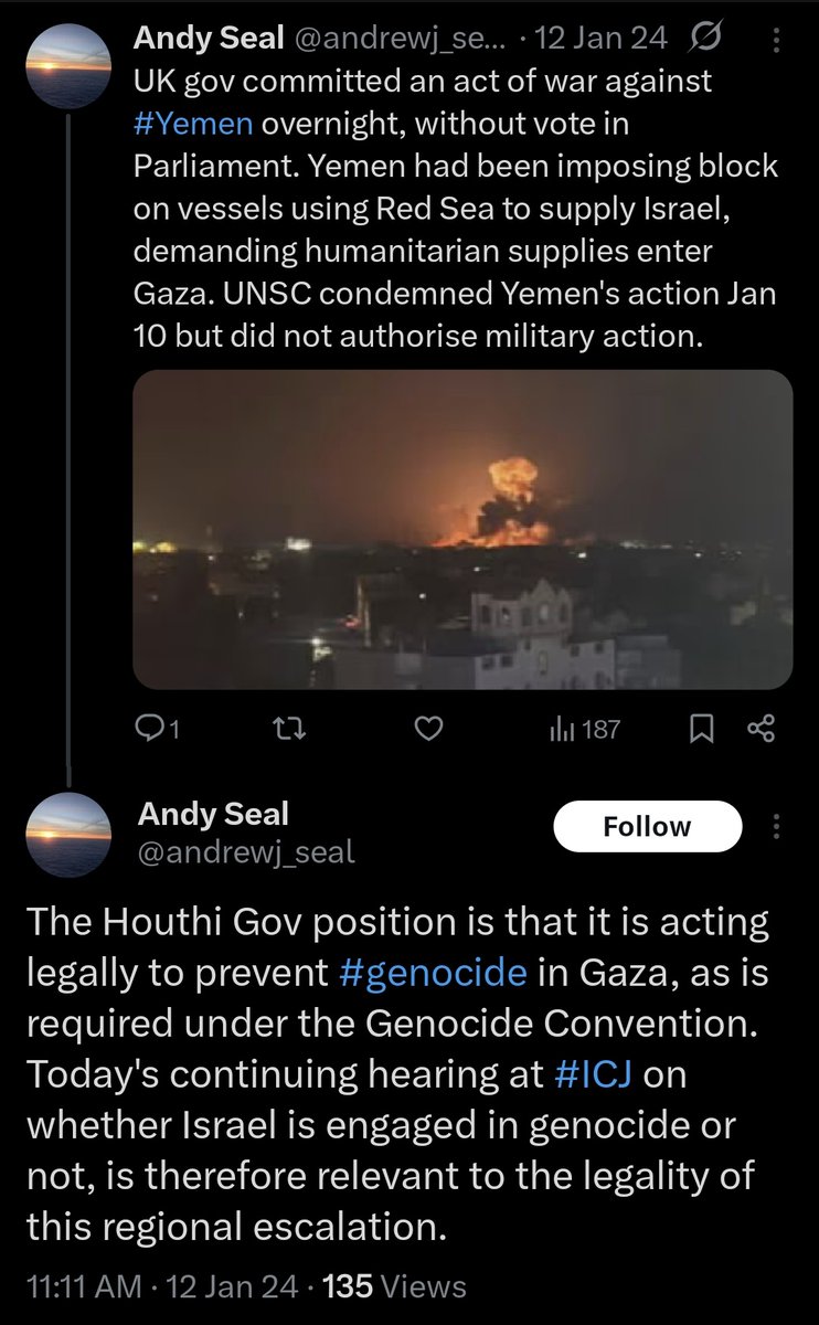Here's Andrew coming to the Houthi terrorists' defense by suggesting that they were merely trying to enforce the Genocide Convention when attacking ships at sea