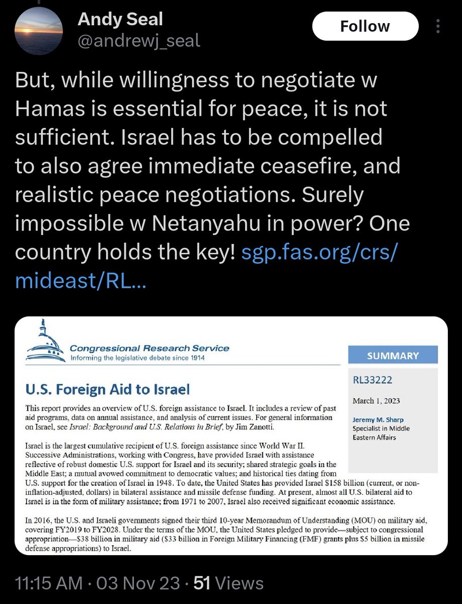 And here he suggested in November 2023 that the U.S. should threaten to cut off aid from Israel
